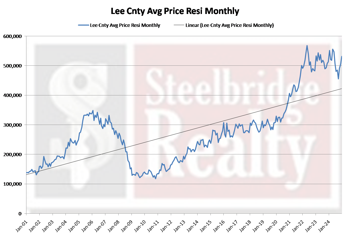 This chart shows Lee County Fl, Average Price for all asset types for residential transactions through the MLS, for the last 2 cycles.