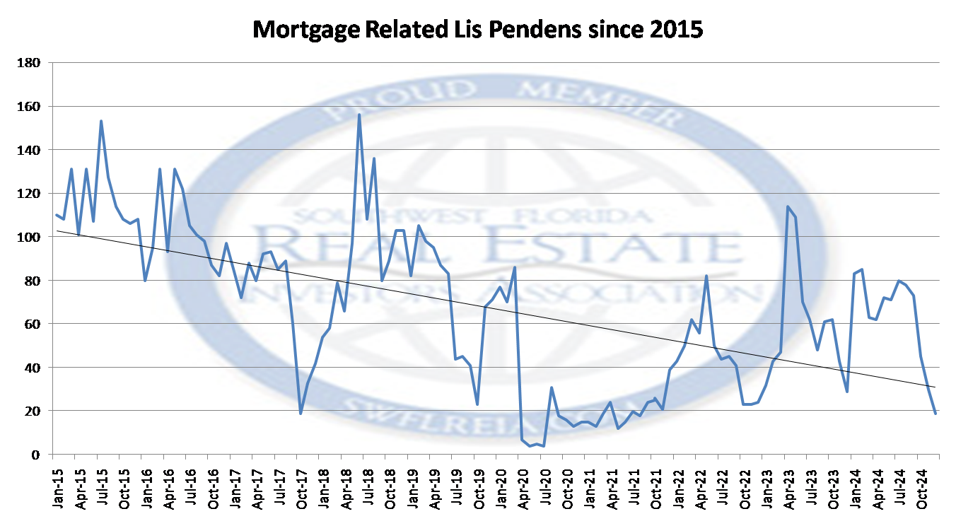 This chart provides a perspective on the December 2024 Lee County Florida Foreclosure Report, comparing data from the last financial crisis to today: